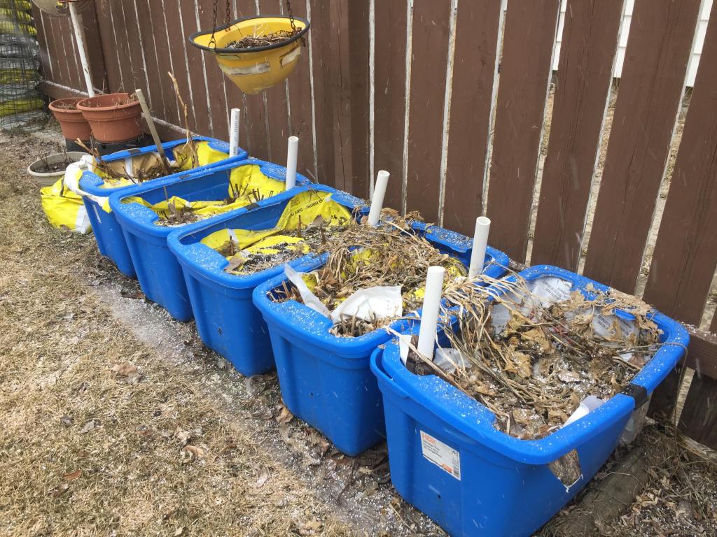 So we purchased four large plastic storage bins with lids and set about establishing a different garden…self-watering container gardening.