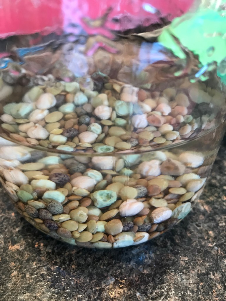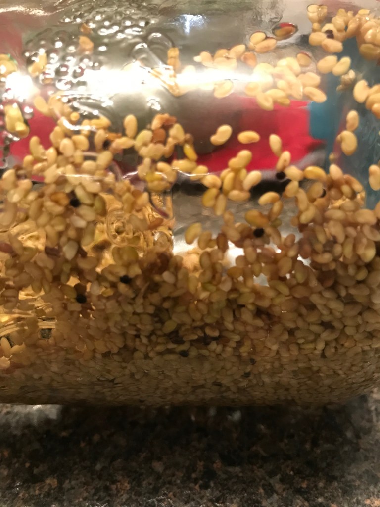 I put the seeds (1 tbsp of alfalfa in one jar and 4 tbsp of Crunchy Bean Mix in another) in water and let them soak while I was at work. Each seed type has a different recommendation on the package which I suggest you follow, at least until you know how much room they’ll take up in the jar.