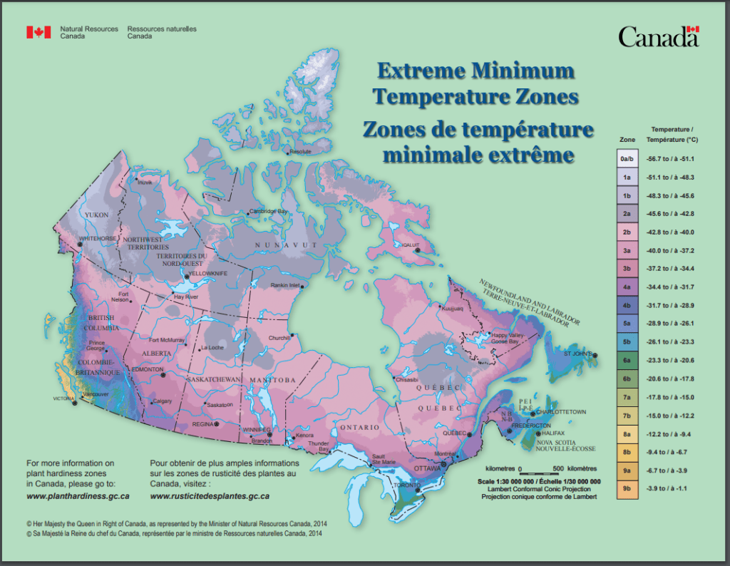 In a nutshell, the temperate zone is what the minimum temperatures can get to in any given area. Here in Canada we range from an area with the coldest temperature at -1.1 degree Celsius (9b) to -56.7 (0b). Now that is cold!